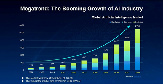 图表2:全球AI市场规模高速增长,预计2032年达2.75万亿美元