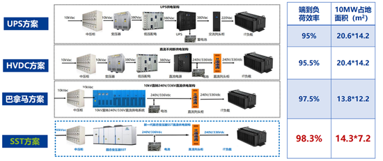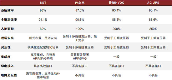 SST方案大幅提升空间利用率和供电效率,长期看有望成为数据中心直流供电的最佳选择。SST路线保留了巴拿马电源的优势,延续一体化设计,最大区别在于采用电力电子技术和高频变压器替代传统工频变压器,减小体积和重量,大幅提高效率。具体优势上: