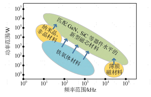 ► 磁芯材料:磁芯材料的损耗特性、饱和磁通密度、散热性能等特性,直接关系着高频变压器的效率、功率密度等性能。目前铁氧体被主要应用在频率低于1MHz的小功率场合,在中频(<100kHz)、大功率(>10kW)应用场合,非晶和纳米晶合金材料性能优异;相较于铁氧体材料,纳米晶合金材料具有更高的饱和磁通密度,且热稳定性能好,但纳米晶的高频损耗较高,并且工艺仍不成熟,当前价格较高,仍有改善的空间。