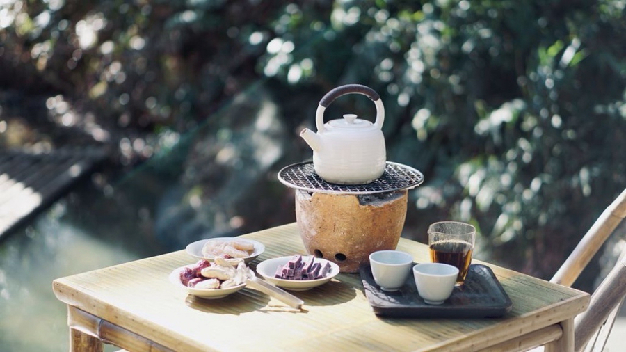 “我们有专供渠道,必须是生态无农药的茶。专业的人做专业的事,才放心。”她坚信,好生态才能产出好味道。除了冬天的腊梅,春天的珠兰、夏天的茉莉、秋天的桂花,都可窨制入茶,配上芡实糕、笋干等茶点和四季鲜果,每一季都有不同的特调茶饮。这种将本地茶产与山中花事相结合的巧思,不也正是中国古老茶文化“创造性转化、创新性发展”的生动实践?