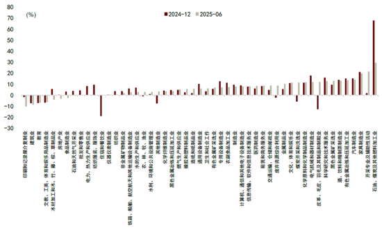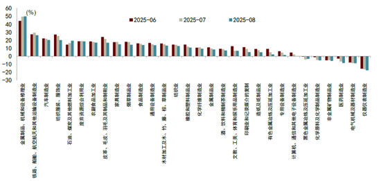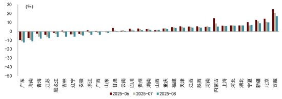反内卷相关政策可能对固定资产投资增速也有一定影响。分制造业行业来看,1-8月增速较低的行业为仪器仪表制造业(-17.6%)、电气机械及器材制造业(-8.8%)、医药制造业(-8.5%)、非金属矿物制品业(-5.8%)、化学原料及化学制品制造业(-5.2%)、黑色金属冶炼及压延加工业(-3.3%),更多集中于原材料制造业。而1-8月原材料制造业投资同比-3.3%,低于装备制造业(3.5%)和消费品制造业(10.1%)。我们认为这固然显示了原材料制造业与房地产周期联系更为紧密,但或也部分与反内卷相关政策更易影响原材料制造业有关。