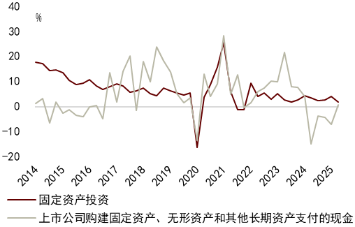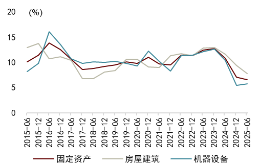 上市公司数据也表现出相似趋势。虽然近年来统计局固定资产与A股上市公司资本开支同比增速有所背离,但是A股上市公司固定资产净值同比增速呈现与统计局数据相似的趋势,2025年上半年末A股上市公司房屋建筑净值同比7.8%,较2024年末的9.4%下降;而机器设备净值同比5.8%,较2024年末的5.5%上升。