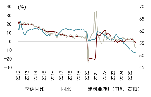 投资增速回落的原因是多方面的:从投资构成来看,1-8月建筑安装工程、设备工器具购置、其他费用累计分别拉动整体固定资产投资-0.6、2.1、-0.1个百分点,较1-3月分别下降2.7、0.4、0.5个百分点,可见近期固定资产投资增速下滑主要受建筑安装工程影响。数据调整可能对投资增速回落有一定影响。我们根据统计局公布的固定资产投资季调环比增速推算的7-8月固定资产投资季调同比增速分别为-0.4%、-0.8%,回落幅度小于我们根据固定资产投资绝对金额和累计同比推算的当月同比增速。此外,美国加征关税和反内卷相关政策可能对固定资产投资增速也有一定影响。