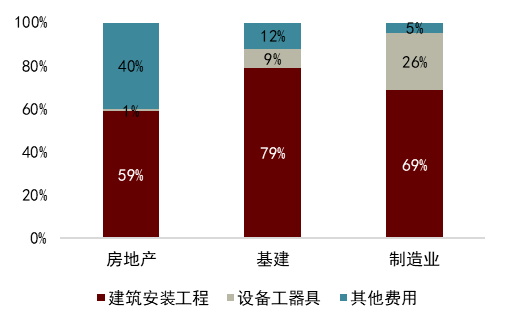 建筑安装工程在基建投资中占比较高。分三大项投资来看,2023年建筑安装工程占比最高的是基建投资,占比为79%;而设备工器具购置占比最高的是制造业投资,占比为26%。建筑安装投资增速的回落最为明显与基建增速的回落幅度高于房地产和制造业是相一致的,而设备工器具购置投资的韧性也与制造业投资的相对韧性也是相一致的。