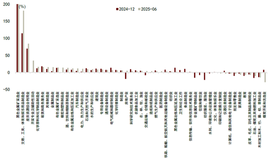 分行业来看,2025年上半年末A股上市公司机器设备净值同比增速较低的行业为煤炭开采和洗选业、木材加工和木竹藤棕草制品业、石油煤炭及其他燃料加工业、皮革毛皮羽毛及其制品和制鞋业、教育,皆为同比负增长;而同比增速较高的行业为黑色金属矿采选业、文教工美体育和娱乐用品制造业、废弃资源综合利用业、开采专业及辅助性活动、化学原料和化学制品制造业。