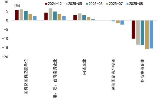 2025年1-8月固定资产投资累计同比0.5%,从2025年1-3月的高点4.2%已经连续五个月回落,且近期有加速回落迹象。分主要行业和企业类型来看,投资增速皆回落,可见并非由单一行业或企业类型完全贡献了固定资产投资增速的下降。