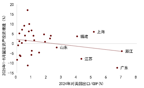 关税不确定性对固定资产投资带来了负面影响。这种现象也出现在2018-2019年中美贸易摩擦期间[4]。从分省数据来看,2025年1-8月部分经济大省固定资产投资增速较低且处于负增长区间,例如广东(-12.4%)、江苏(-7.8%)、安徽(-4.6%)、浙江(-3.9%)、山东(-2.0%)等。而分省对美国出口占GDP比重与固定资产投资增速的散点图也呈现负相关关系,显示关税不确定性或也在一定程度上影响了固定资产投资。