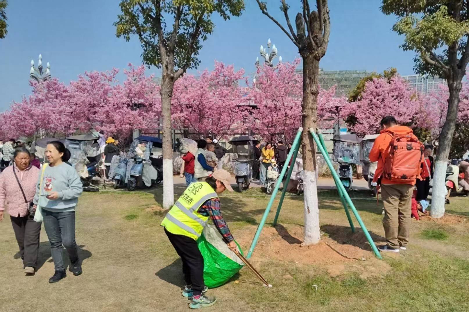 而在二妃山公园、西苑公园、韵湖公园等同样备受市民青睐的热门踏青赏樱点位,面对激增的客流,现场工作人员高效运转,全力保障园路无垃圾堆积、公厕洁净无异味、草坪绿地无杂物。他们的辛勤付出,为市民在喧嚣都市中开辟出一方可以闹中取静、舒心惬意的游园空间,让市民能够全身心沉浸在樱花烂漫的春色之中。